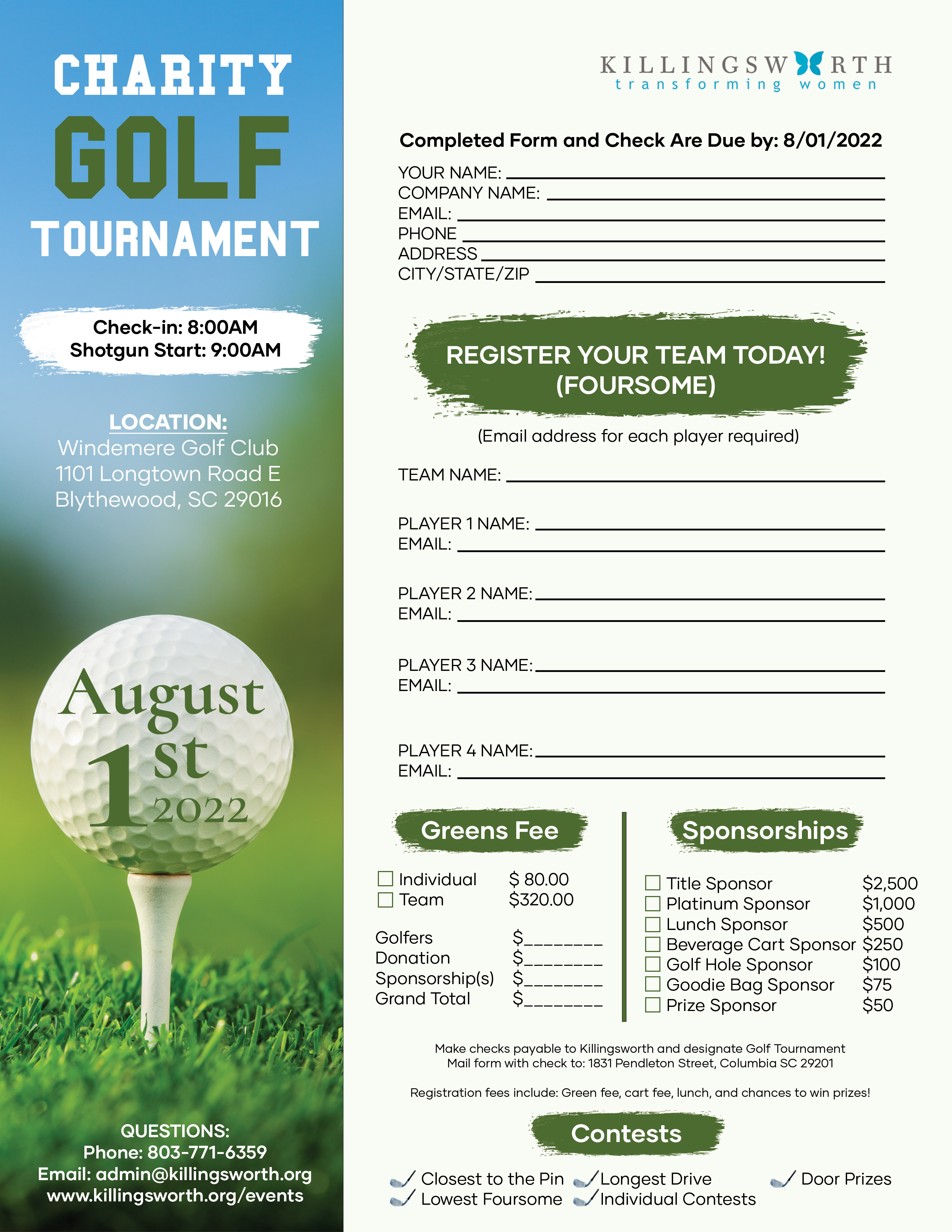 Join us for a day of golf at the Killingsworth annual Golf Tournament. We are excited to return to Windermere this year on August 1, 2022. Lunch and the opportunity to win door prizes will be available. Sponsorships are available, please call Killingsworth at 803-771-6359 for sponsorships or additional information.